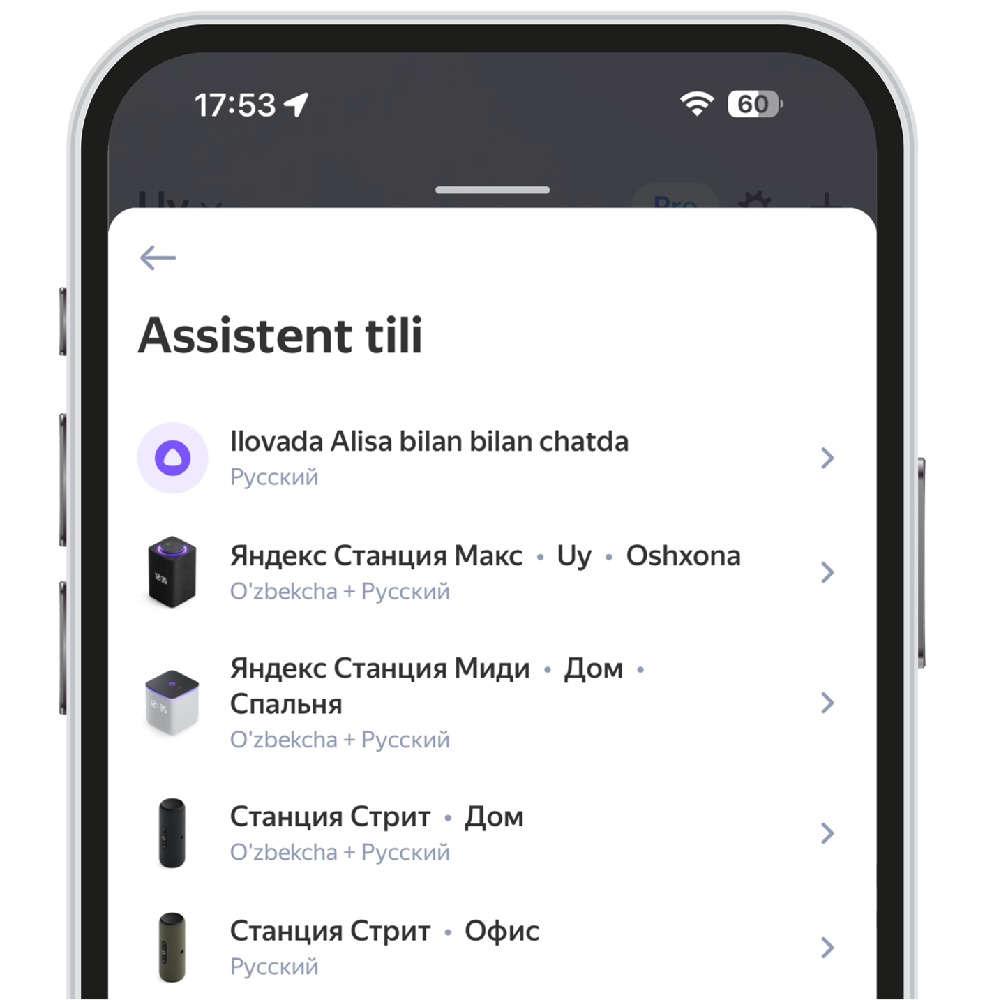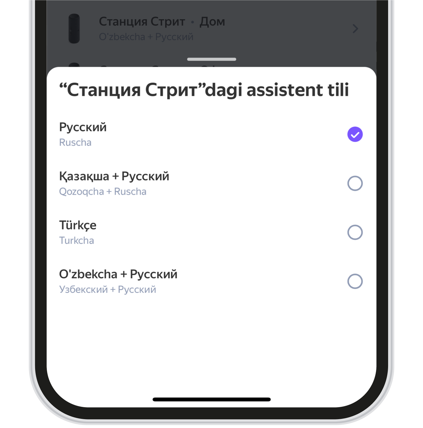 - Agar muayyan ustun uchun tilni belgilamoqchi bo‘lsangiz, uni qurilmalar ro‘yxatidan tanlang va Assistent tili bandiga kiring.